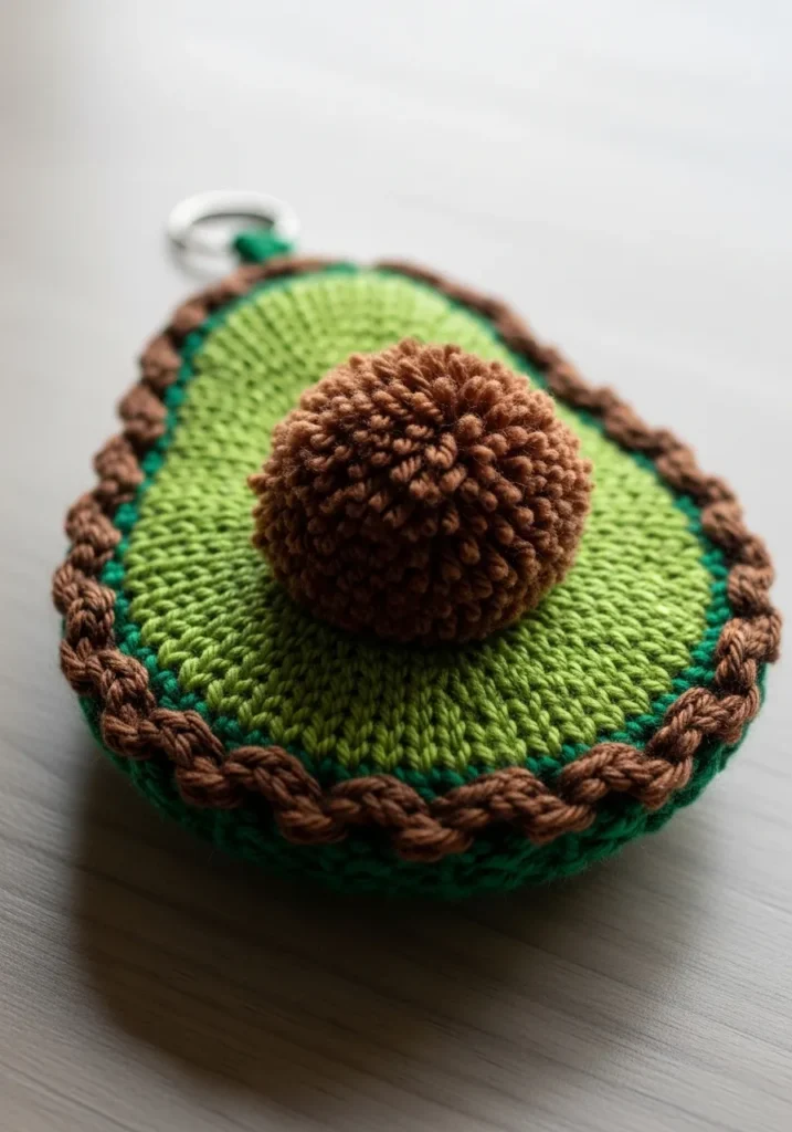 This adorable knit keychain pouch is shaped like a tiny avocado, complete with a soft green body and a darker green border that outlines the shape. The center features a fluffy brown pom pom that perfectly mimics the avocado pit and adds a fun 3D touch. The stitches look snug and slightly textured, giving it that cozy handmade feel while still holding its shape. A small loop at the top attaches easily to keys or a bag, making it both cute and practical.