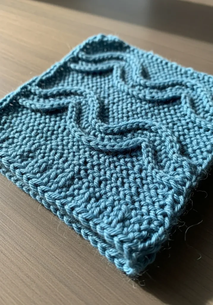 This lovely knit washcloth is worked in a calming dusty blue yarn with a softly textured base that feels sturdy yet gentle to the touch. Raised leaf motifs are stitched across the surface, giving it a subtle botanical pattern that adds depth without overwhelming the design. The edges are neatly finished with a tidy border that frames the square and keeps it from curling. The stitches have that slightly plush handmade look, which makes it feel cozy and practical at the same time.