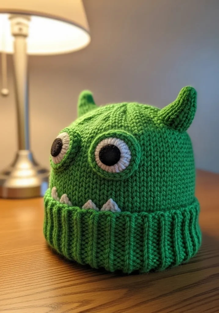 This quirky knit beanie is worked in a bold grassy green yarn that instantly grabs your attention. The thick ribbed brim adds stretch and comfort, while the smooth body keeps the shape simple and snug. The real fun comes from the oversized round eyes and tiny white knit teeth peeking over the brim, along with two little pointed horns on top. The stitches look soft and slightly plush, giving the hat that cozy handmade charm with a big splash of personality.