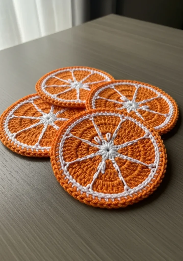 These cheerful knit coasters are designed to look just like fresh orange slices, and they are such a fun pop of color. The base is worked in bright citrus orange yarn with creamy white segments stitched in to mimic the juicy interior of the fruit. A slightly darker orange border frames each round coaster and gives it a neat finished edge. The stitches are tight and textured, creating a sturdy surface that still feels soft and handmade.