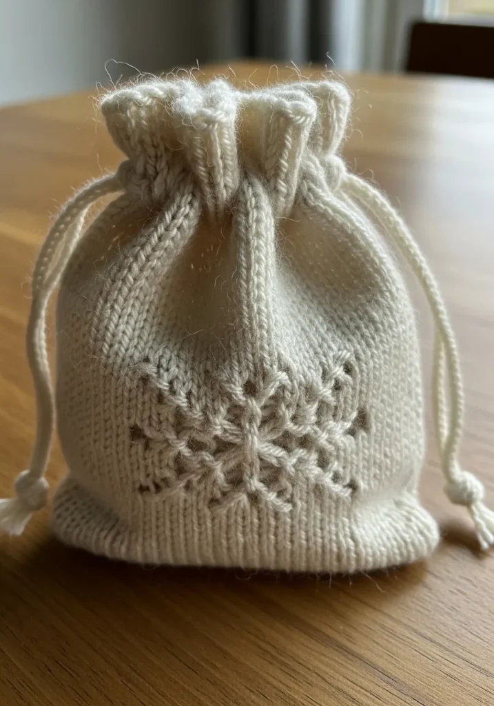 This charming knit gift pouch is worked in a soft cream yarn that feels cozy and slightly fluffy to the touch. The body is smooth and rounded with a snug ribbed base that helps it stand upright. At the center, a delicate snowflake motif is stitched into the fabric, adding a subtle winter detail that feels both elegant and festive. The top gathers with simple knit drawstrings that tie into neat little knots, giving it that classic handmade finish.