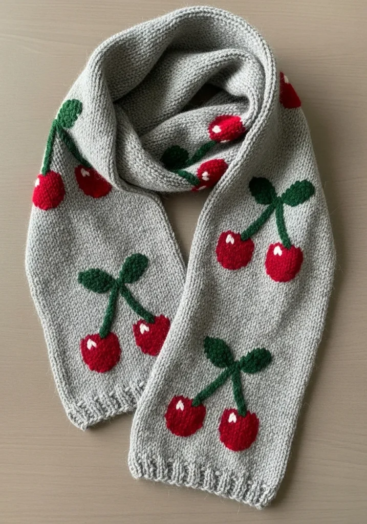 I am completely smitten with scarves like this because they turn a simple shape into something full of personality. Once the base is knit, adding the cherry details feels fun and creative rather than complicated. If you are short on time but still want a gift that feels thoughtful and handmade, this is such a lovely option. I can just imagine someone wrapping this around their neck and instantly feeling a little brighter on a chilly day.