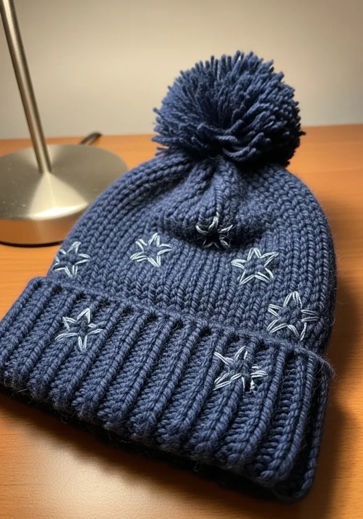 This cozy knit beanie is worked in a deep navy blue yarn with a thick ribbed brim that folds up for extra warmth and texture. The body is smooth and snug, topped with a fluffy pom pom that gives it that classic winter charm. Scattered across the hat are delicate stitched stars in soft pale gray, adding a dreamy night sky feel without overpowering the rich blue base. The stitches look plush and slightly fuzzy, which makes the whole piece feel warm, soft, and wonderfully handmade.