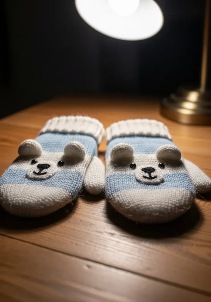 These adorable knit mittens feature the sweetest little polar bear faces right on the front. They are worked in soft white and pale blue yarn with gentle horizontal stripes that add a cozy winter feel. Each mitten has tiny rounded ears, stitched black eyes, and a small embroidered nose that bring the bear to life in the cutest way. The ribbed cuffs look stretchy and snug, while the overall texture feels plush and warm with that slightly fuzzy handmade finish.
