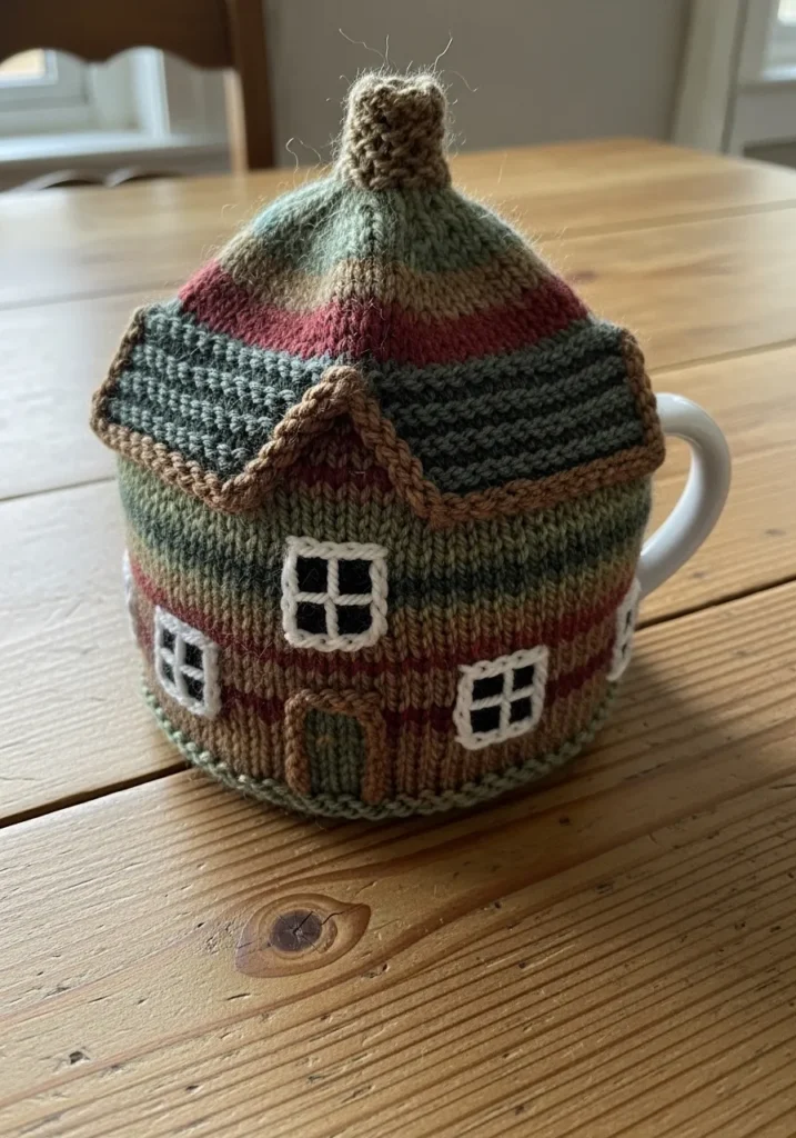 This adorable knit mug cozy is designed to look like a tiny cottage wrapped right around your cup. It features earthy stripes in soft green, warm brown, and muted red yarn, giving it a rustic storybook feel. The roof detail folds over slightly with textured stitches, while little white embroidered windows and a stitched door bring the whole house to life. The snug knit fabric hugs the mug comfortably, adding both insulation and charm in one sweet package.