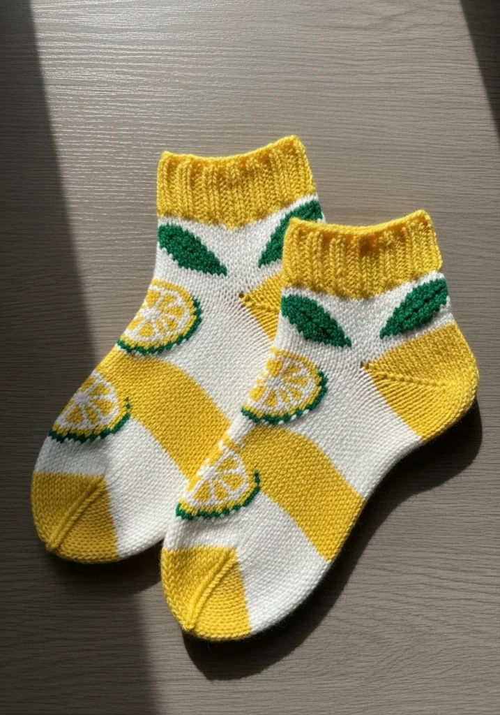 These cheerful knit ankle socks are bursting with bright yellow and crisp white stripes, finished with playful lemon slice motifs and tiny green leaves near the cuffs. They look like they were made from soft cotton blend yarn, giving them a smooth texture with just a hint of cozy stretch. The toes and heels are worked in solid sunshine yellow, which frames the fruity design and makes the colors pop even more. The stitches are neat but still have that slightly textured handmade feel that makes knit socks so charming.