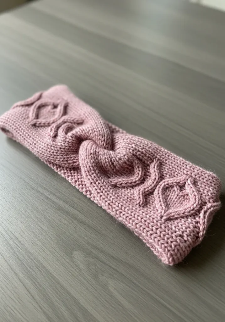 This soft knit headband is worked in a dusty blush pink yarn that feels cozy and smooth with a gentle stretch. The center features a classic twisted knot that adds texture and shape, while delicate raised heart motifs run along each side for a sweet romantic touch. The stitches look even and plush, giving it that warm handmade charm we all love. The overall design is simple yet feminine, with just enough detail to make it feel special.