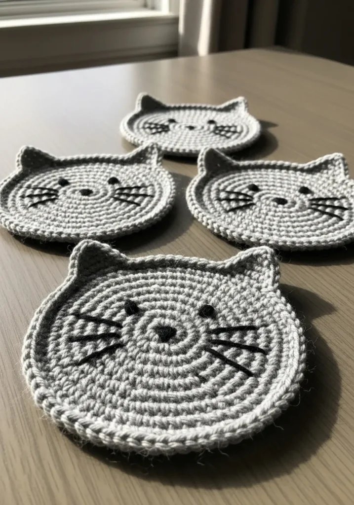 These sweet knit coasters are shaped like round little cat faces with tiny pointed ears at the top. They are worked in a soft light gray yarn with neat circular stitches that create a subtle spiral texture. Simple black stitched eyes, a small nose, and whiskers bring each kitty to life without overpowering the clean design. The edges are slightly raised, giving them a finished look while keeping that cozy handmade feel.