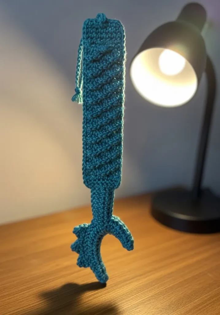 This playful knit bookmark is shaped like a tiny dragon tail, worked in a rich teal yarn that gives it a magical vibe. The body features textured stitches that resemble scales, while the end flares out into a small fin like tail detail that peeks out from the bottom of a book. The yarn looks soft but sturdy, with a slightly chunky texture that adds depth and character. The overall design is slim and practical, yet full of personality.