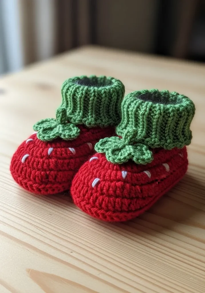 These adorable knit baby booties are designed to look like plump little strawberries, and they are almost too cute to handle. The main body is worked in a rich berry red yarn with tiny white stitched seeds scattered across the surface. The cuffs are knit in a leafy green ribbed pattern that folds softly at the ankle, complete with a sweet scalloped edge that mimics strawberry leaves. The texture looks plush and cozy, with neat stitches that give the booties structure while still feeling soft and flexible.