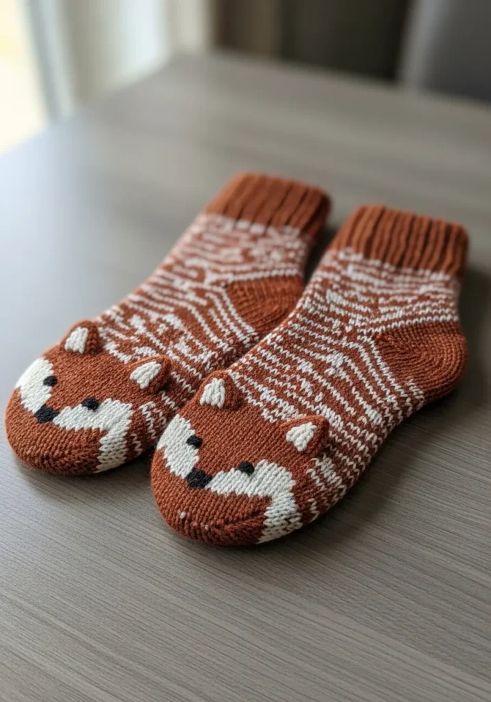 These adorable knitted socks feature sweet little fox faces right on the toes, worked in warm rust brown with creamy white details and tiny black eyes. The ribbed cuffs look snug and stretchy, while the smooth stockinette body shows off neat colorwork patterns that add texture without feeling busy. The small raised ears give them extra personality, and the yarn has that soft, slightly fuzzy look that makes handknits feel extra cozy and loved.