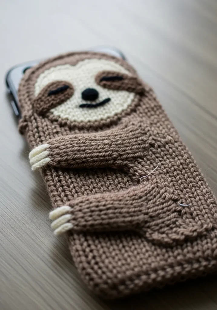 This adorable knitted phone sleeve is shaped like a cozy sloth hugging your phone, worked in soft brown yarn with a creamy face panel. The texture is smooth and dense which helps protect the phone while still feeling flexible. Little knitted arms wrap around the front and add a playful touch that makes the design feel alive. The stitched eyes and tiny smile give it that sleepy sloth expression that instantly makes it charming and hard to put down.