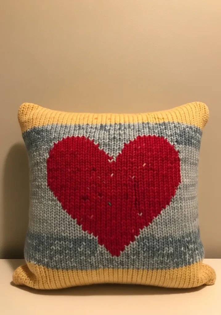 This cozy knitted pillow features a bold red heart right at the center, set against soft gray stripes with warm buttery yellow edging. The stitches are clearly defined and slightly textured which gives it that classic handmade look. The heart design feels simple but eye catching and the gentle color contrast makes it easy to style on a couch or bed. The overall shape is plush and inviting with just enough structure to hold its form.