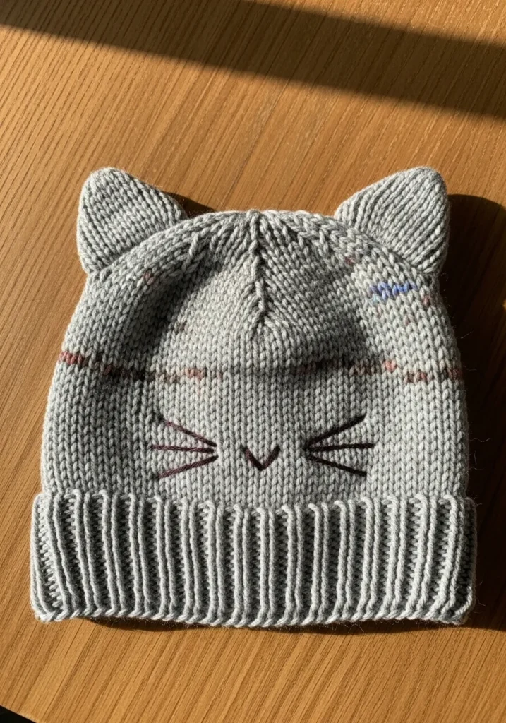 This adorable knit beanie is made with a soft gray yarn that has a cozy medium weight feel and visible stitch texture. The ribbed brim keeps it snug and comfy while the smooth body shows off simple shaping. Pointed cat ears sit neatly on top and give it that playful silhouette. The stitched whiskers and tiny nose on the front add just enough detail to make it feel expressive without being overdone. It looks warm wearable and full of personality.