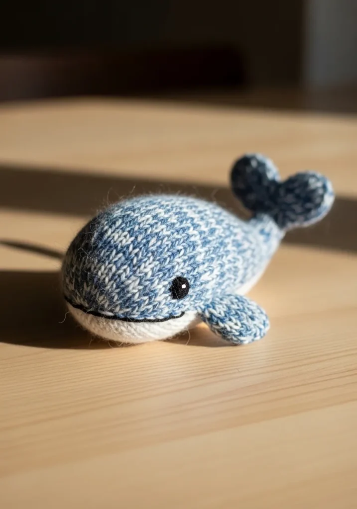 This sweet little knitted whale is made with soft blue and white yarn that gives it a gentle speckled look, almost like ocean waves. The stitches are tight and smooth which helps the shape feel sturdy while still staying cuddly. Small fins and a rounded tail add simple details, and the tiny black eye gives it just the right amount of personality. It is compact and softly shaped, making it feel charming and perfectly palm sized.
