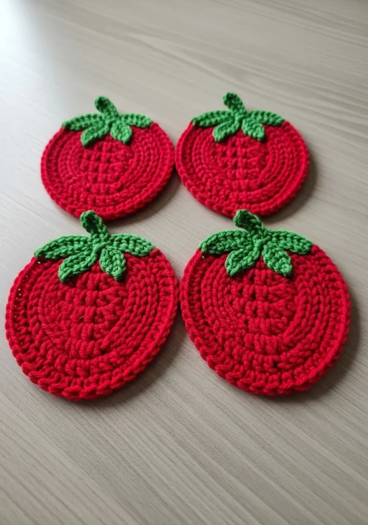 This cute coaster set features bright red strawberry shapes with textured stitches that give them a juicy handmade look. Each piece has a round body with visible spiral stitching and a leafy green top that adds a playful pop of color. The yarn looks soft yet sturdy which makes them practical for everyday use while still feeling decorative. Arranged together they instantly brighten up a table and feel fun without being over the top.