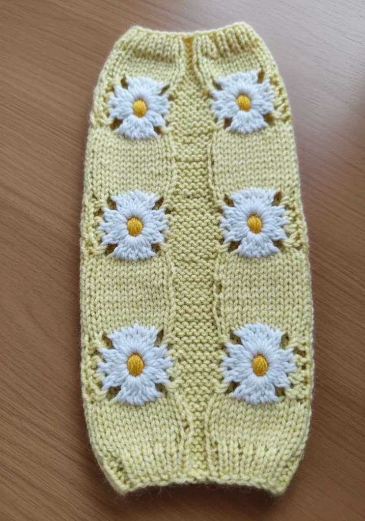 This sweet knitted leg warmer is worked in a soft buttery yellow yarn with raised white daisy flowers stitched right into the fabric. Each flower has a sunny yellow center that pops against the background and gives the whole piece a happy handmade feel. The texture mixes smooth stockinette with gentle ridges that add interest without feeling bulky. The ribbed edges keep it snug while still looking relaxed and cozy.