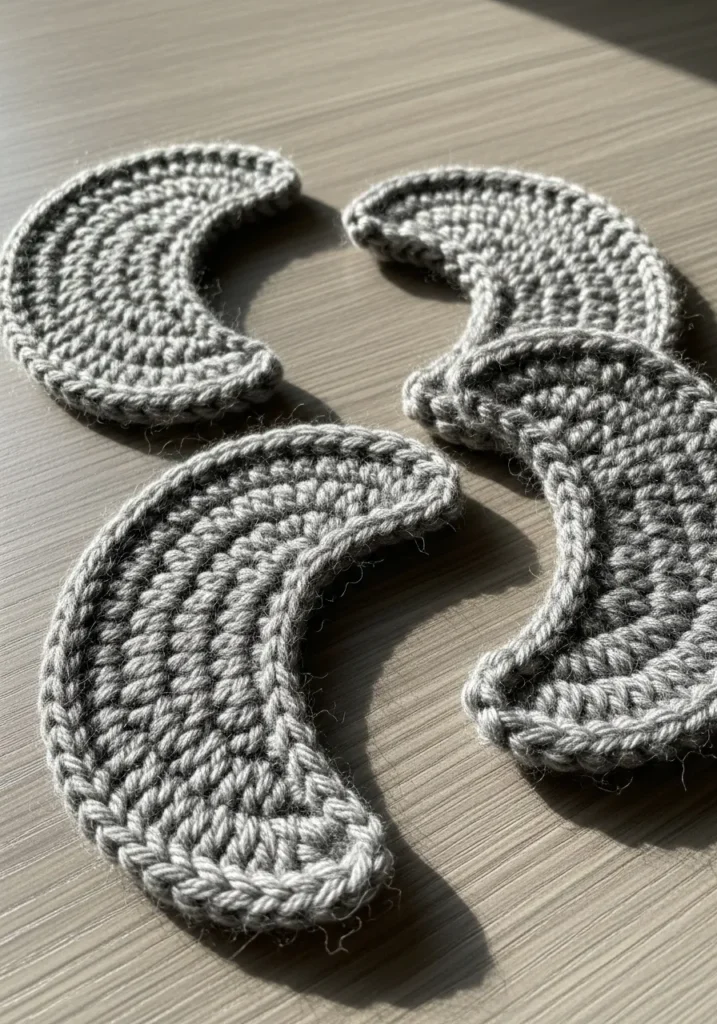 These chunky knitted coasters are shaped like soft crescent moons and worked in a cozy medium gray yarn that shows off every stitch. The texture is thick and squishy with gentle ridges that give them a handmade look without feeling rough. The rounded curves are smooth and slightly imperfect in the best way which makes them feel warm and real. Laid out together they look like little moons resting on the table and somehow make even a plain surface feel calmer.