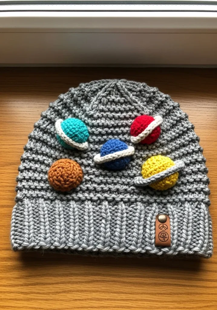This cozy knitted beanie is worked in a soft medium gray yarn with a chunky textured stitch that feels warm and squishy. The fun really comes from the colorful planet details stitched on top. Little knitted spheres in teal red blue yellow and warm brown sit across the hat with simple white rings that make them look like tiny planets floating in space. The ribbed brim keeps it snug while the textured body gives it that handmade look that feels relaxed and wearable.