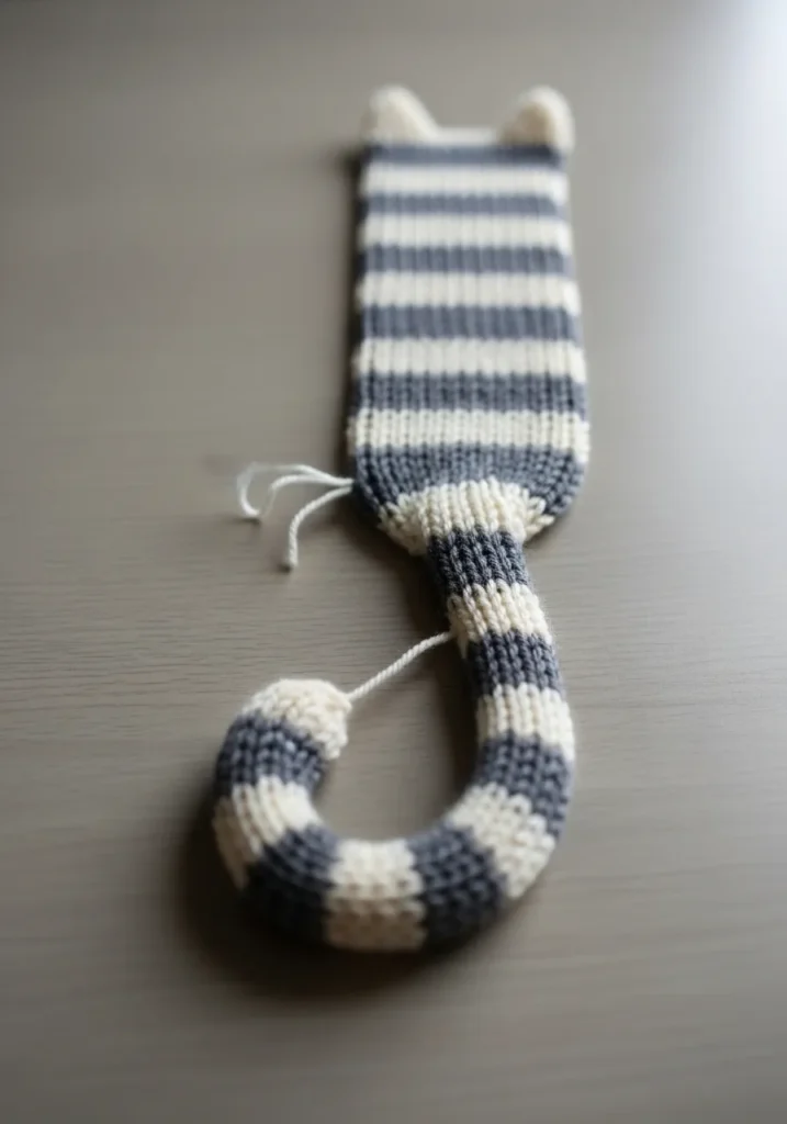 This charming knitted bookmark is shaped like a long cat with a playful curled tail at the end. It is worked in soft yarn with alternating gray and cream stripes that give it a cozy and slightly whimsical look. The texture is smooth and even with gentle stitch definition that feels nice in your hands. Little pointed ears at the top add just enough character while keeping the overall design simple and clean.