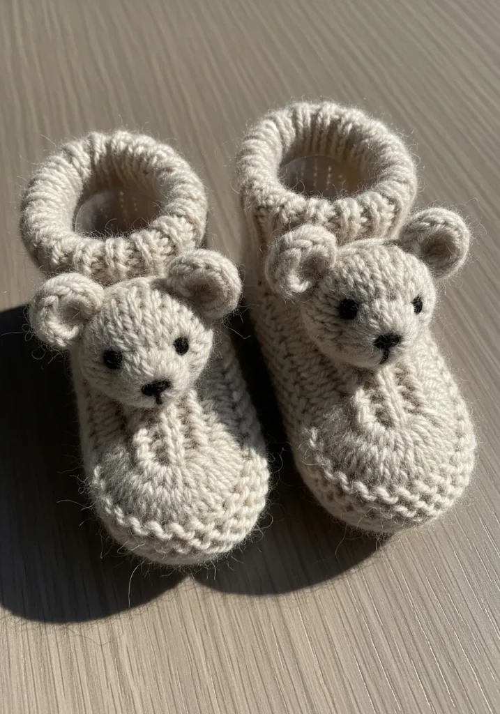 These sweet knitted baby booties are shaped like tiny bears with soft rounded ears and simple stitched faces. The yarn looks plush and cozy in a warm oatmeal shade that feels gentle and classic. The texture is thick and squishy with visible stitches that show off the handmade charm. Ribbed cuffs help them stay snug while the little bear noses and eyes add just the right amount of cuteness without feeling fussy.