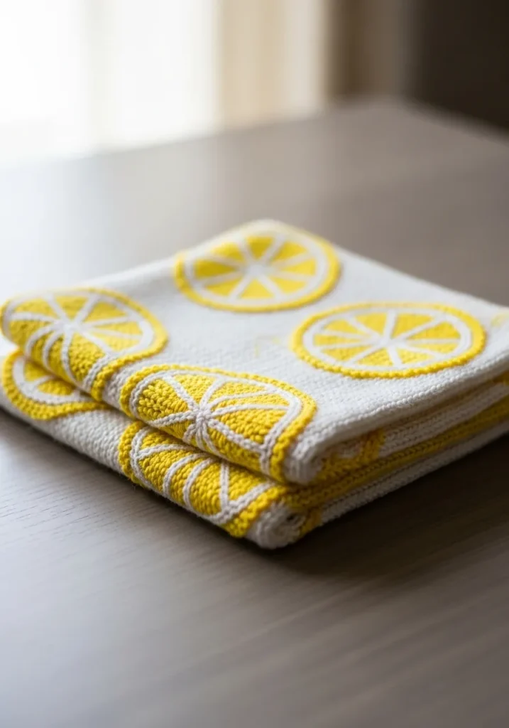 This cheerful knitted dishcloth is worked in soft cotton yarn with a clean white base and bright yellow lemon slice motifs scattered across the surface. Each lemon has simple stitched segments that give it a fun textured look without feeling bulky. The fabric looks sturdy yet flexible with visible stitches that show off its handmade charm. Folded up it feels neat and fresh and brings a pop of sunshine to an everyday kitchen item.