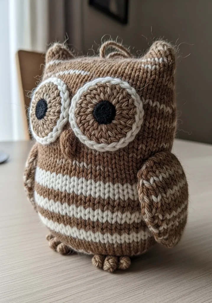This small knitted owl features alternating brown and cream stripes that give it a playful woodland feel. The round body is softly stuffed for a cuddly shape, with oversized circular eyes that stand out against the textured knit stitches. Little wings and tiny feet add dimension without complicating the design, keeping the overall look cute and beginner friendly.