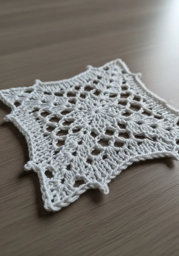 This small knitted lace coaster features a soft ivory cotton yarn worked into an intricate star shaped pattern with airy eyelets and scalloped edges. The design feels light and elegant with fine stitches radiating from the center to create a delicate snowflake inspired look. Its flat structure and detailed texture make it perfect for resting a cup while adding a subtle handmade touch to a coffee table or desk.