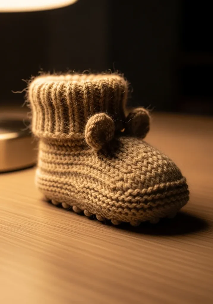 This tiny knitted bootie is worked in a warm neutral brown yarn with a soft ribbed cuff that folds gently at the top. The smooth garter stitch body keeps the design simple and beginner friendly, while the small decorative bow on the side adds just enough detail to make it extra cute. Its snug shape and soft texture make it perfect for newborn photos or thoughtful handmade gifts.