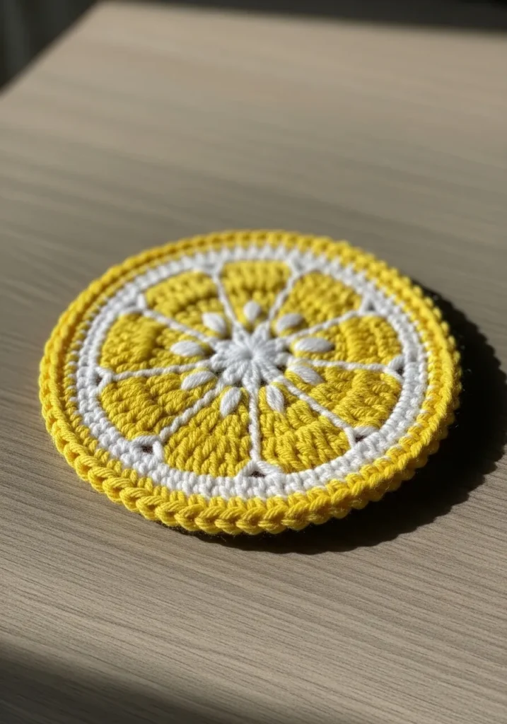 This cheerful round coaster is designed to look like a bright lemon slice, complete with segmented wedges and a contrasting white center. The vibrant yellow yarn gives it a fresh and playful look, while the neat circular shaping keeps it flat and practical for everyday use. The stitches are tight and even, creating a sturdy texture that can handle warm mugs while still looking adorable on a coffee table.