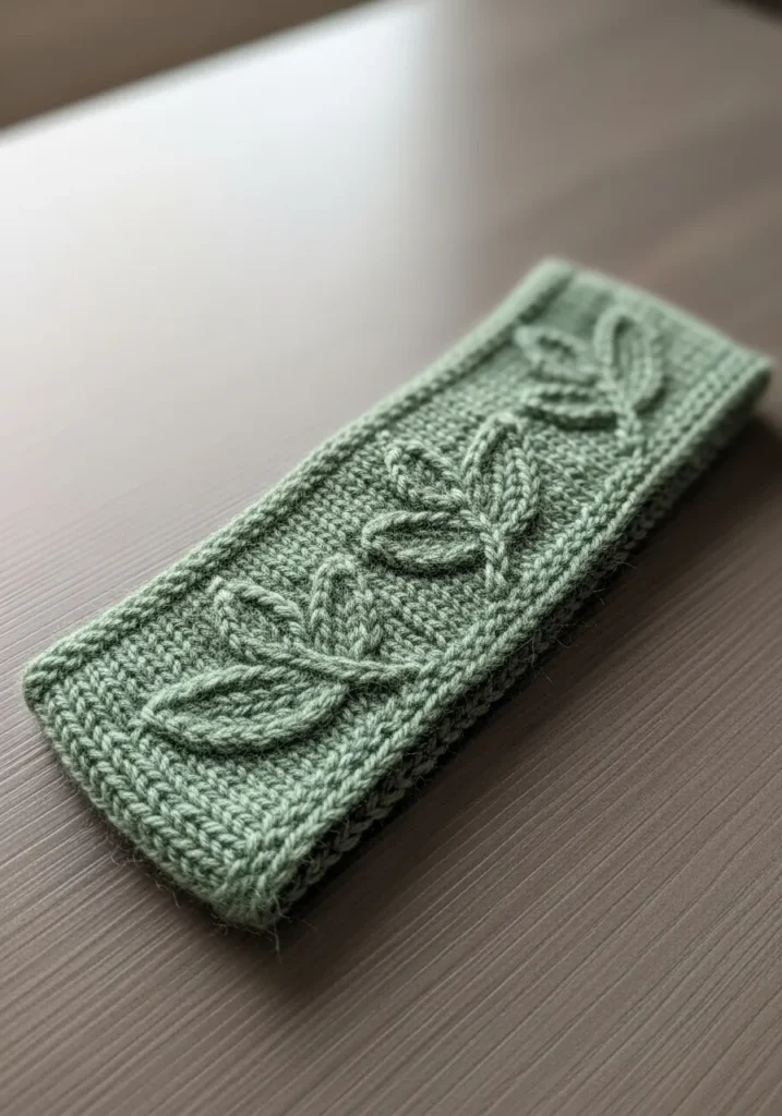 This slim knitted headband is crafted in a soft sage green yarn with a delicate leaf motif running along the center. The subtle cable work creates gentle texture shifts that make each leaf stand out beautifully against the smooth background stitches. The yarn has a light natural fuzz that adds warmth, while the flat, stretchy shape keeps it practical and easy to wear for everyday styling.