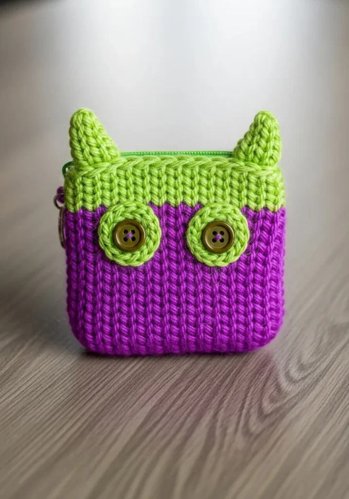This tiny knitted pouch features a playful monster design in bold purple and bright lime green yarn. The compact rectangular body is neatly stitched with tight, even rows, while two little horns and round button like knit eyes give it loads of personality. Its small size makes it perfect as a keychain or coin pouch, and the soft yarn texture adds a cozy handmade charm.