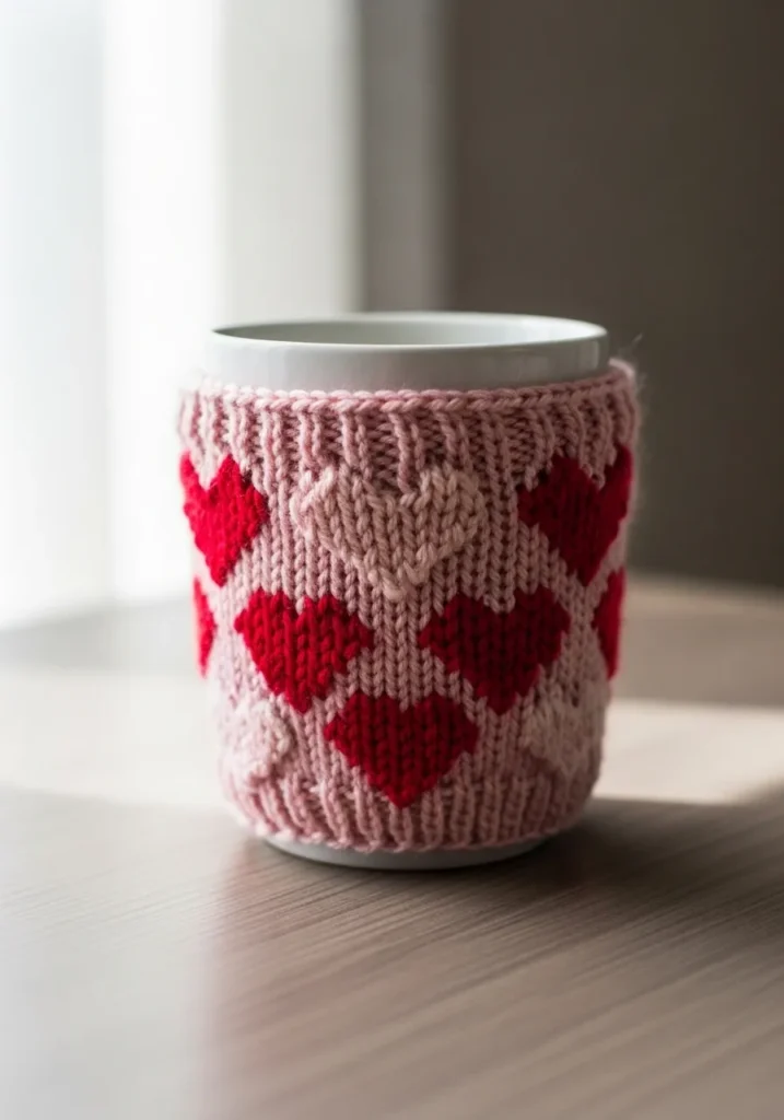 This knitted mug cozy features a soft blush pink base with bold red hearts stitched across the front for a playful pop of color. The ribbed edges at the top and bottom help it hug the mug snugly, while the smooth stockinette background keeps the heart pattern crisp and eye catching. The yarn looks warm and slightly plush, making the whole piece feel cozy and perfect for chilly mornings.