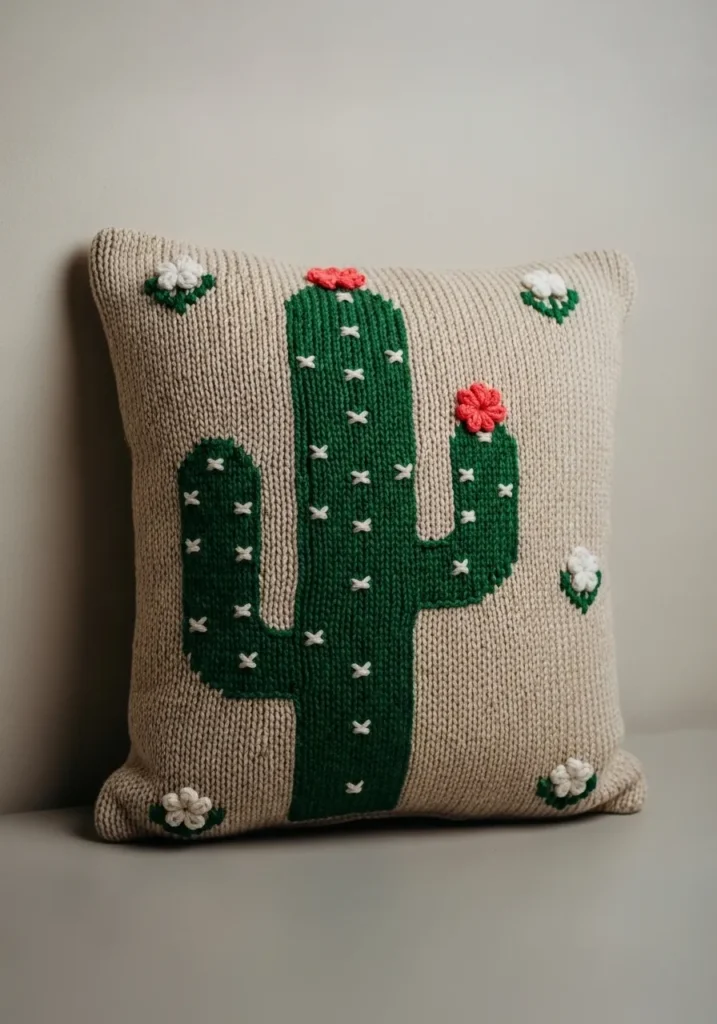 Knitted Cactus Pillow Cover With Floral Accents