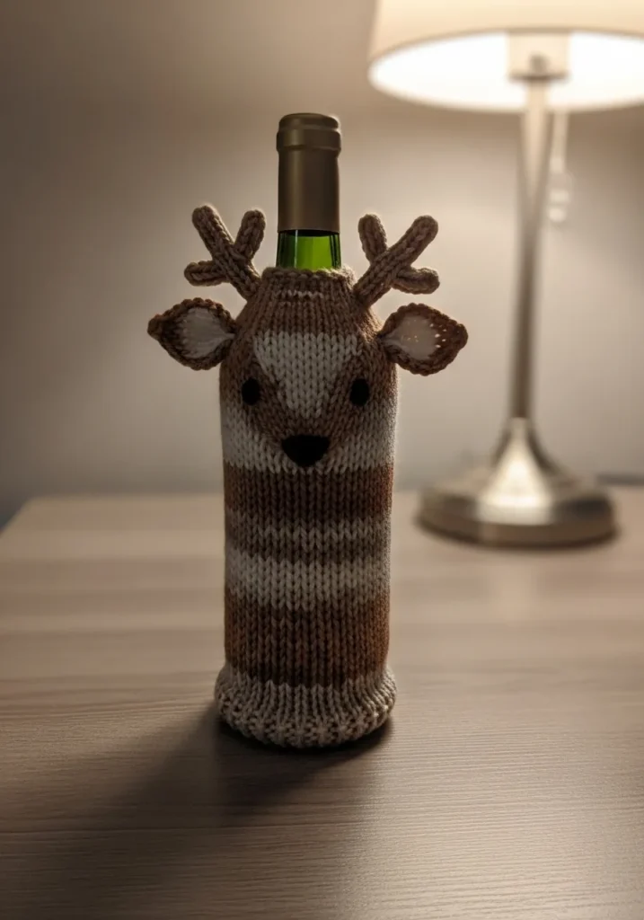 This adorable knitted wine bottle cozy is designed to look like a sweet little reindeer, complete with soft brown and cream stripes and a friendly face. The body is worked in smooth stockinette stitch with a snug ribbed base that hugs the bottle securely. Tiny knitted antlers and ears add dimension at the top, while stitched black eyes and a small nose bring the character to life. The yarn has a gentle fuzz and natural stitch variation that makes it feel warm and handcrafted.
