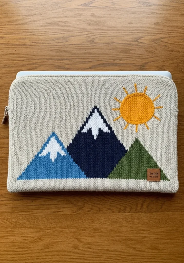 This cozy knitted laptop sleeve features a clean cream base with a bold mountain landscape stitched across the front. Snow capped peaks in navy and sky blue sit beside a deep green hill, all under a bright golden sun. The design is worked in smooth stockinette with crisp color changes that give it a graphic, modern look. The fabric appears thick and cushioned, with slight yarn fuzz and natural stitch variation that make it feel warm and handmade rather than factory made. A simple zipper closure keeps everything secure while maintaining a neat silhouette.