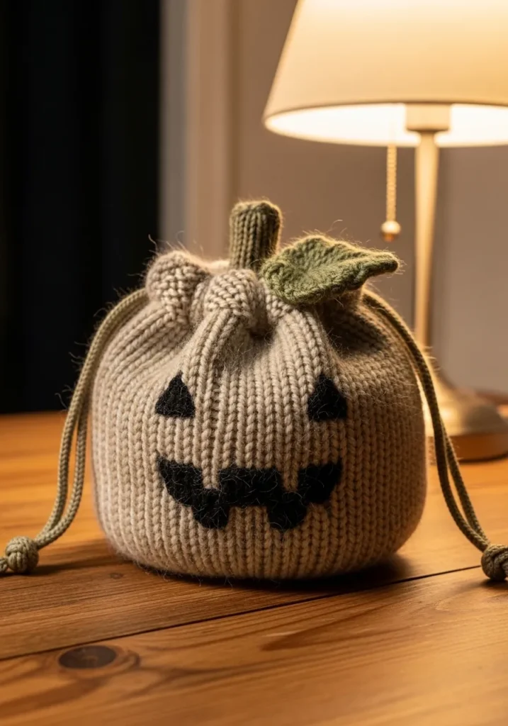 This adorable knitted drawstring bag is shaped like a plump little pumpkin, worked in a soft neutral beige yarn with vertical ribbing that mimics real pumpkin grooves. The top gathers neatly with knitted cords that tie on each side, creating a cute pouch shape. A small knitted stem and a textured green leaf sit at the top for that extra autumn charm. The jack o lantern face is stitched in black, giving it a playful and slightly spooky expression. You can see gentle yarn fuzz and natural stitch variation that make it feel warm and handmade.