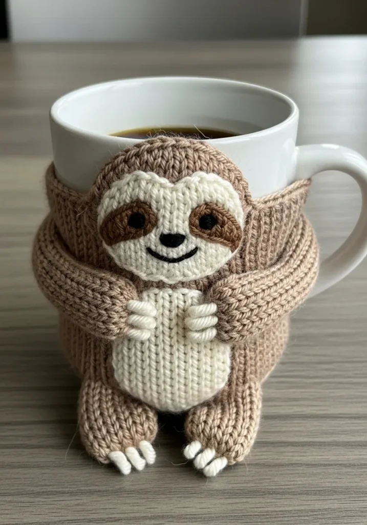This adorable knitted coffee cup cozy is designed to look like a sweet little sloth wrapping its arms around your mug. It is made with soft brown and cream yarn, featuring a ribbed body that stretches snugly around the cup. The sloth’s face is carefully shaped with layered knit pieces, tiny dark eyes, and a stitched smile that gives it so much personality. The small arms and legs are lightly stuffed for dimension, and you can see subtle yarn fuzz and natural stitch variations that make it feel warm and handmade.