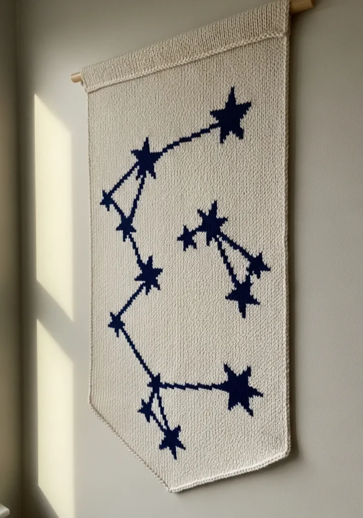 This elegant knitted wall banner features a soft cream base with a bold navy constellation pattern stitched across the front. The stars are connected with clean lines that create a simple yet eye catching celestial design. The fabric has a smooth stockinette texture with a neatly finished top edge folded over a wooden dowel for easy hanging. The bottom tapers slightly into a subtle point, giving it that modern wall decor feel. You can see gentle yarn fuzz and natural stitch variation that add warmth and handmade character.