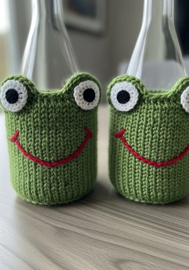 This adorable knitted bottle holder is shaped like a cheerful little frog, worked in a rich green yarn with a snug ribbed texture. The rounded top features two raised eyes made from white and black yarn circles, giving it that classic wide eyed frog look. A bright red stitched smile curves across the front, adding extra personality. The fabric looks soft yet sturdy, with gentle yarn fuzz and natural stitch variation that make it feel handmade and cozy. It hugs the bottle securely while turning an ordinary drink into something playful.