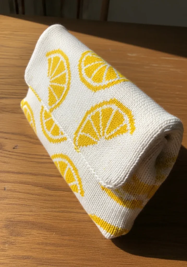 This fresh and cheerful knitted clutch is worked in a creamy white yarn with bright yellow lemon slice motifs scattered across the surface. The lemons are stitched in a bold graphic style with clean segment lines that pop against the neutral background. The fabric looks smooth and tightly knit, giving the bag structure while still keeping that soft handmade feel. It folds neatly over at the top to create a simple flap closure, and the rounded edges add to its relaxed summer vibe. The subtle yellow stripe near the bottom ties the whole citrus theme together.