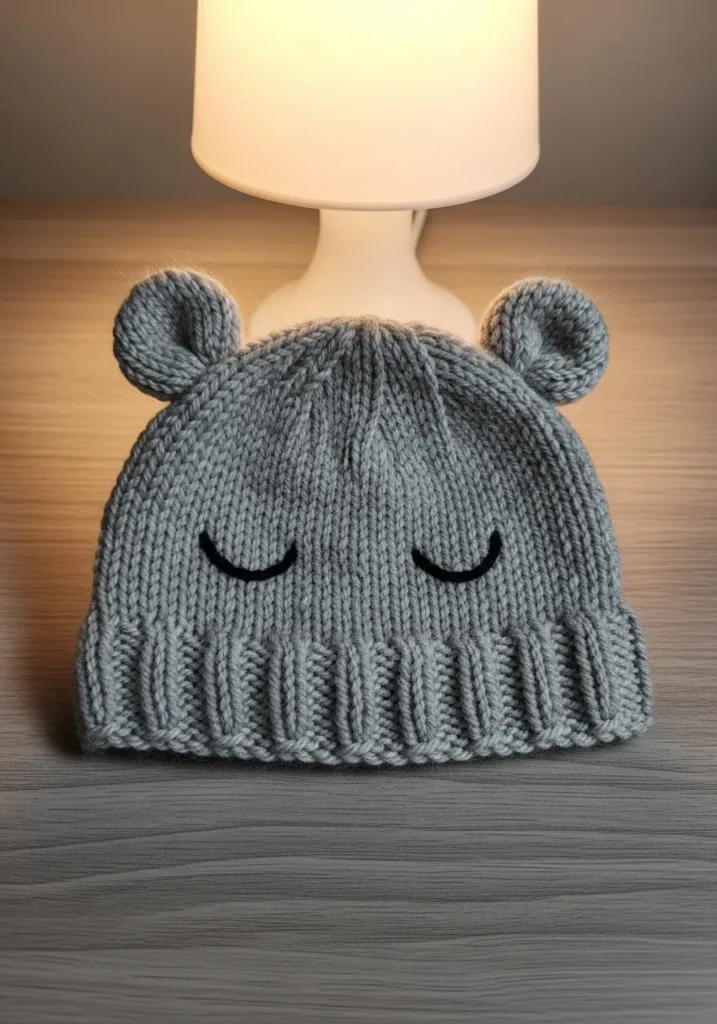 This sweet little beanie is knitted in a soft heather gray yarn with a smooth stockinette body and a chunky ribbed brim that folds up for extra coziness. Two rounded bear ears sit neatly on top, giving the hat an adorable woodland feel. The front features simple stitched sleepy eyes in black yarn, which add a calm and dreamy expression. The texture looks plush and warm, with just enough structure to hold its shape while still feeling gentle against delicate skin.