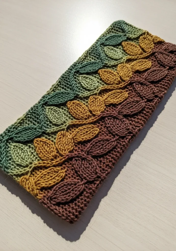 This beautiful knitted headband features a wide band worked in rich earthy shades that shift from deep brown to mustard, olive, and forest green. The standout detail is the raised leaf motif that runs across the front, creating a textured vine effect that feels cozy and seasonal. The stitches have a soft, slightly chunky look with natural yarn fuzz and subtle variations that highlight its handmade charm. The leaf shapes are sculpted and dimensional, giving the whole piece a warm fall inspired vibe.