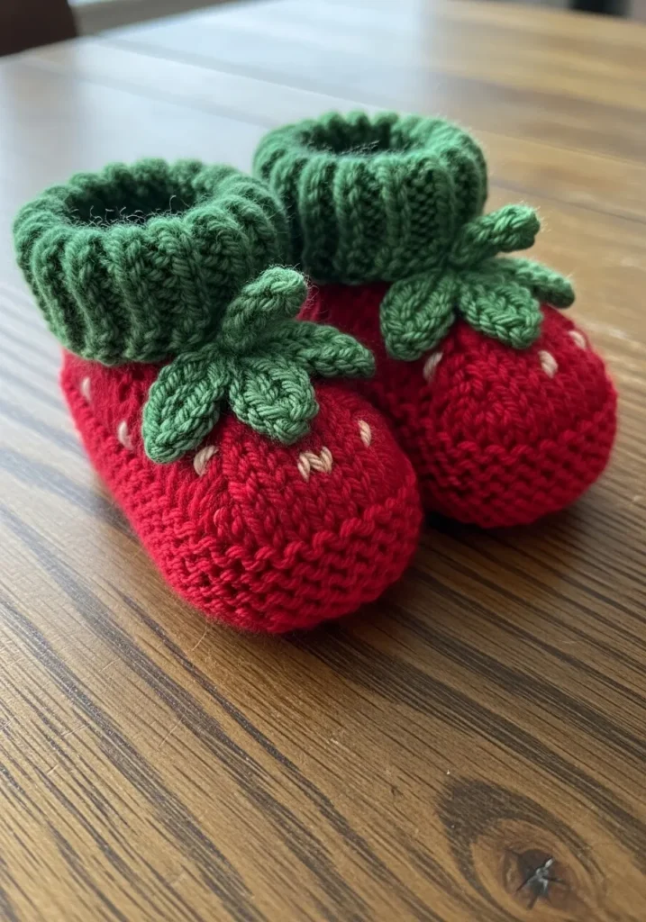 Knitted Strawberry Baby Booties With Leaf Cuffs