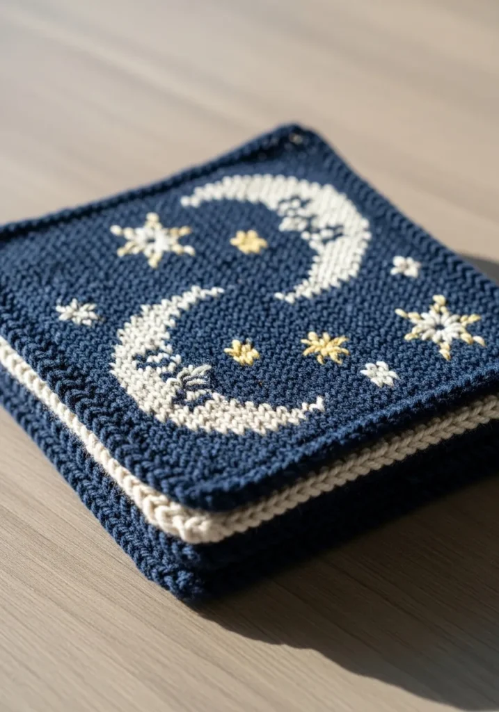This charming knitted dishcloth set features a deep navy blue base with a crescent moon and scattered stars worked in soft cream and pale yellow yarn. The design has a cozy garter stitch texture that feels sturdy yet gentle in the hand. The moon curves gracefully across the square, with tiny star details adding a whimsical night sky effect. The edges are neatly bordered in a contrasting cream trim, and you can spot subtle yarn fuzz and slight stitch variations that highlight its handmade character.
