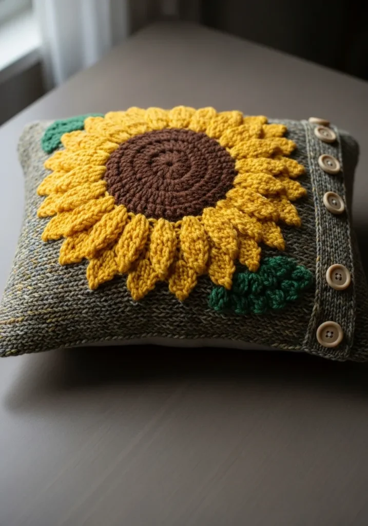 This knitted pillow cover features a large textured sunflower blooming across the front in rich yellow and deep brown yarn. The raised petals add wonderful dimension against the neutral background, and leafy green accents bring the design to life. On one side, a neat row of wooden buttons creates a practical closure that also adds rustic charm.