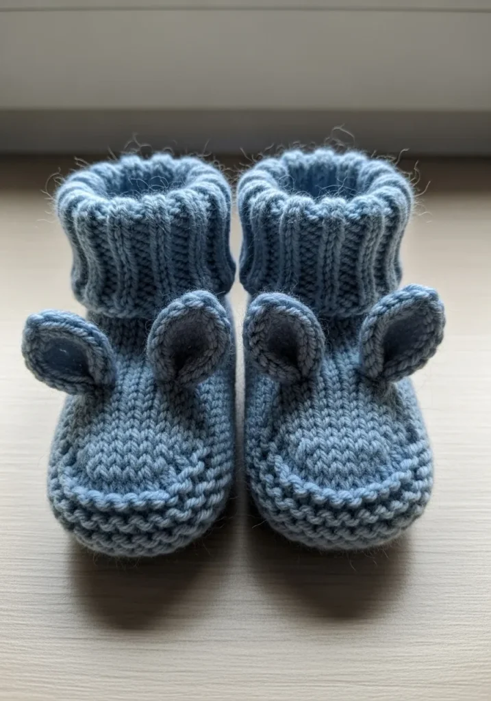 These tiny blue baby booties feature soft rounded toes and sweet little ear details stitched onto the front. The thick ribbed cuffs look extra stretchy and cozy, helping the booties stay gently in place. The smooth stockinette body and tidy garter edges create a clean and classic finish that feels both practical and adorable.