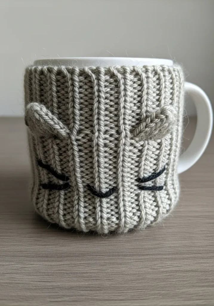 This soft grey mug cozy is knit in deep vertical ribbing that stretches beautifully around the cup. Little knitted details form sleepy eyes and a simple stitched smile, giving it a playful personality while staying minimalist. The thick texture looks warm and slightly fuzzy, hugging the mug securely without slipping.