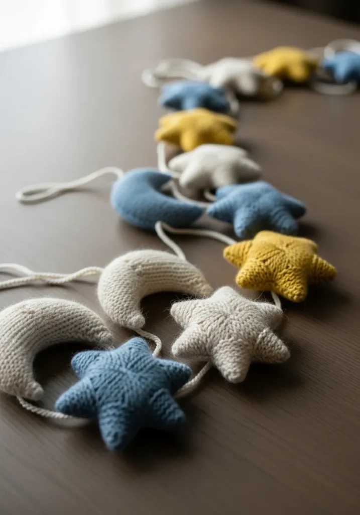 This sweet garland features plush knitted stars and crescent moons in soft blue, creamy white, and gentle mustard tones. Each shape looks lightly stuffed for a rounded finish, and they are evenly spaced along a simple cord. The smooth stitches and tidy seams give the whole piece a dreamy and cohesive look.