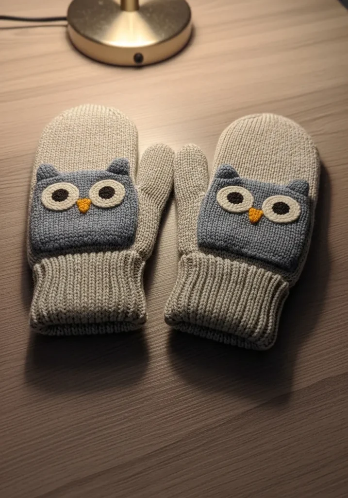 These cozy mittens feature a soft cream base with a sweet grey owl face panel on the front, complete with wide eyes and a tiny yellow beak. The ribbed cuffs look thick and stretchy, and the thumbs are neatly shaped and positioned for comfort. The color contrast keeps the owl design crisp and easy to see.